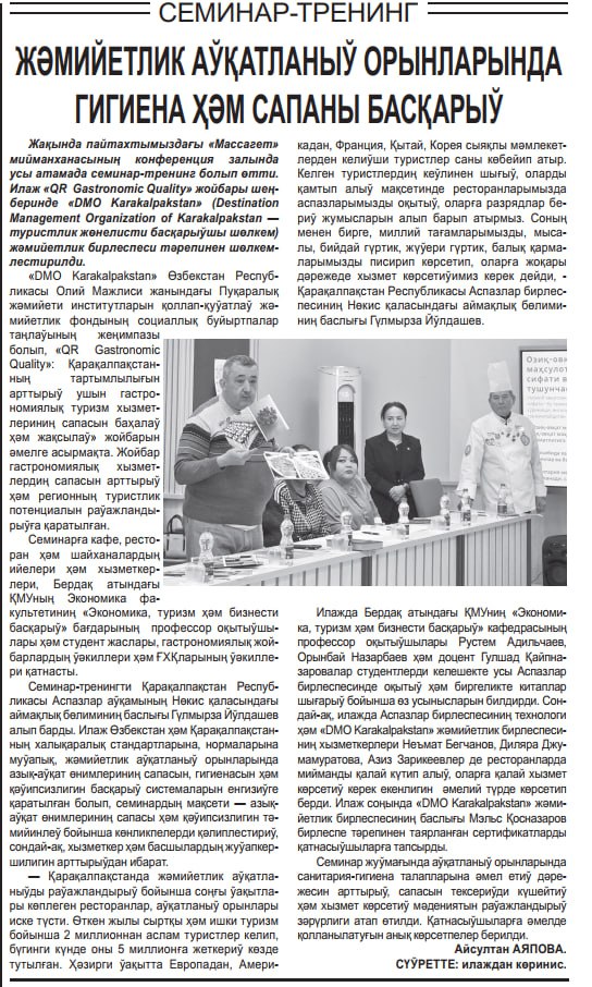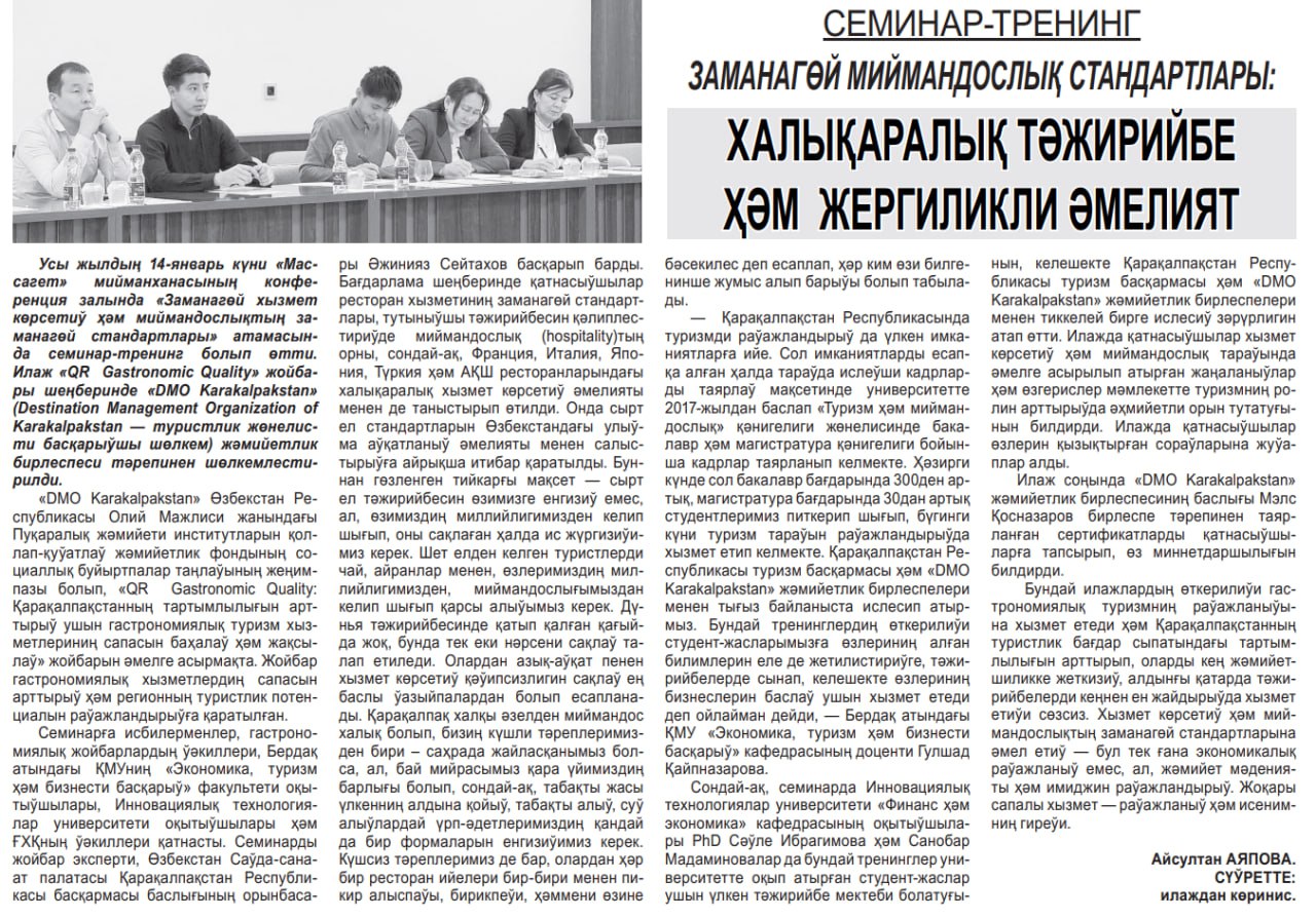 The newspaper “ЕРКИН ҚАРАҚАЛПАҚСТАН” provides broad and informative coverage of events and seminars aimed at the development of the tourism sector in Karakalpakstan. In particular, the public association “DMO Karakalpakstan” regularly informs readers about organized training seminars, round tables, and practical activities.