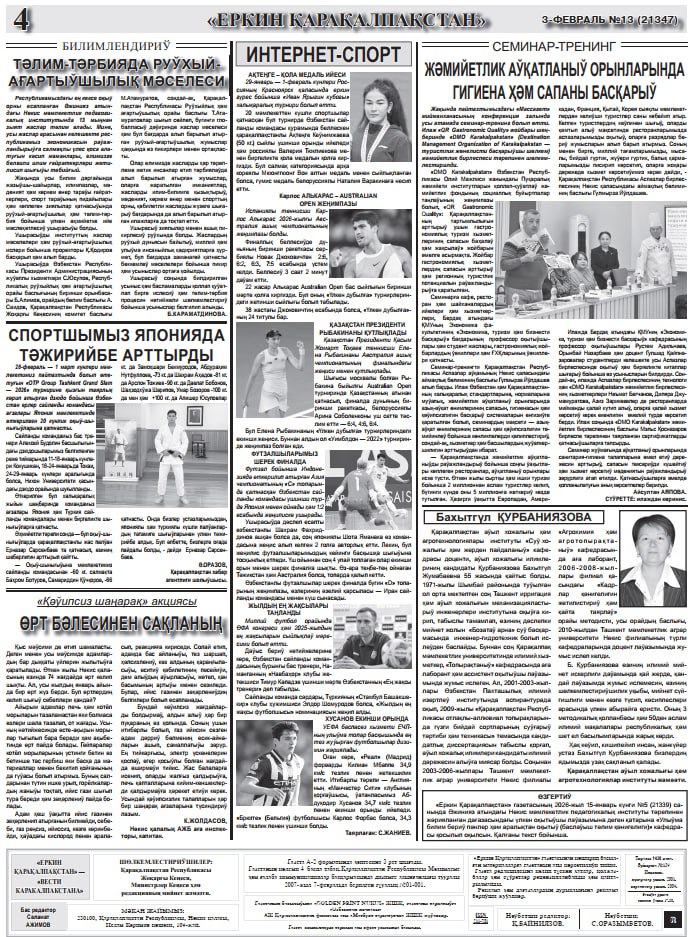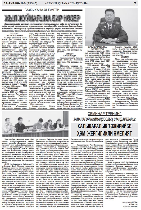 The newspaper “ЕРКИН ҚАРАҚАЛПАҚСТАН” provides broad and informative coverage of events and seminars aimed at the development of the tourism sector in Karakalpakstan. In particular, the public association “DMO Karakalpakstan” regularly informs readers about organized training seminars, round tables, and practical activities.